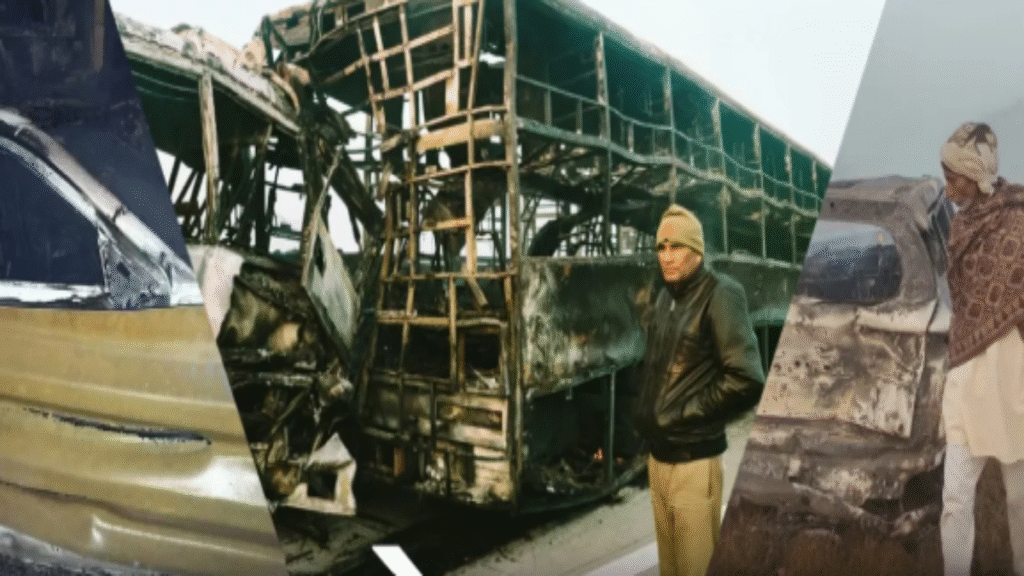घने कोहरे के कारण कई वाहन आपस में टकरा गए। बस और कारों की भिड़ंत में कई लोग घायल हुए।